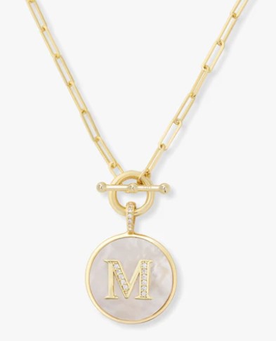 LOVE LETTERS MEDALLION NECKLACE - LETTER "M"<br>18K GOLD PLATED OVER BRASS<br>MOTHER OF PEARL & PAVÉ SIMULATED DIAMONDS<br>20 INCHES Lennon's W.B. Wilcox Jewelers New Hartford, NY